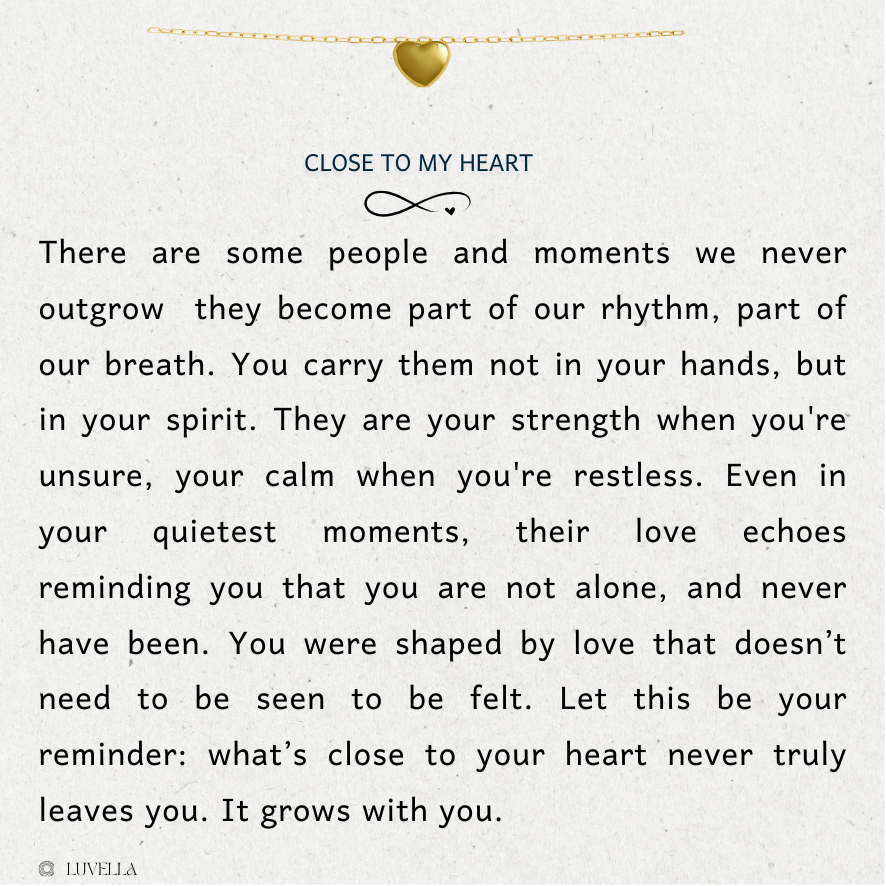 The Close to My Heart Necklace represents the quiet resilience and lasting love we carry within. A meaningful keepsake that celebrates strength, calm, and enduring connection.