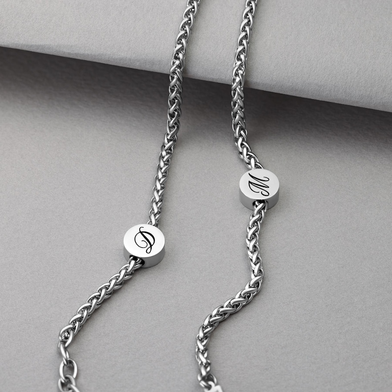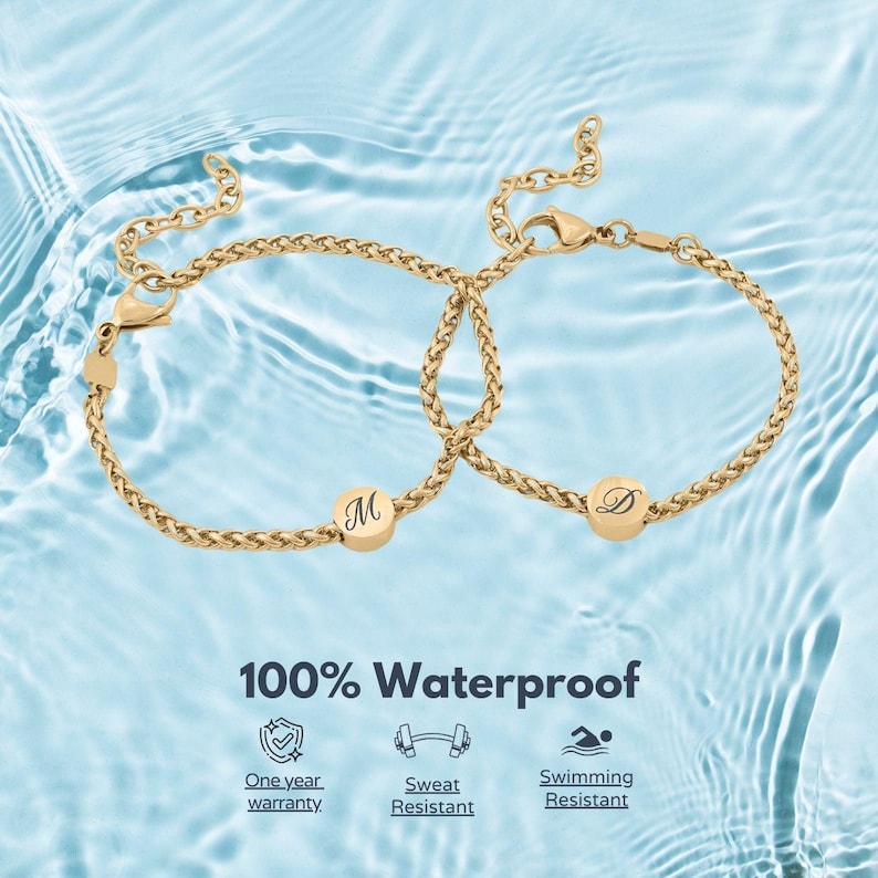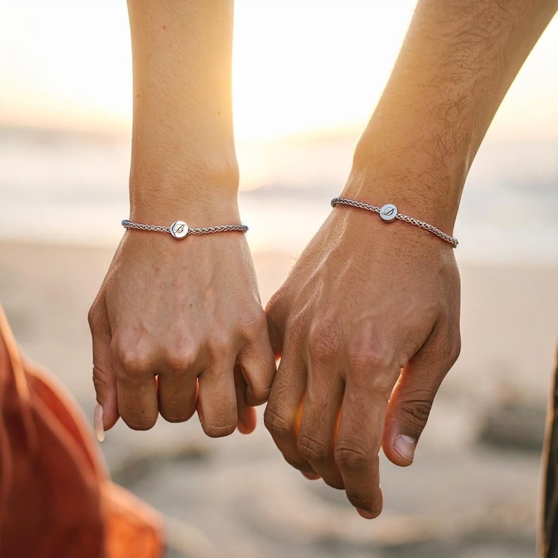 Each bracelet features a custom engraved initial charm, representing two lives connected by love. Whether worn together or apart, it’s a daily reminder that your hearts are always linked.
