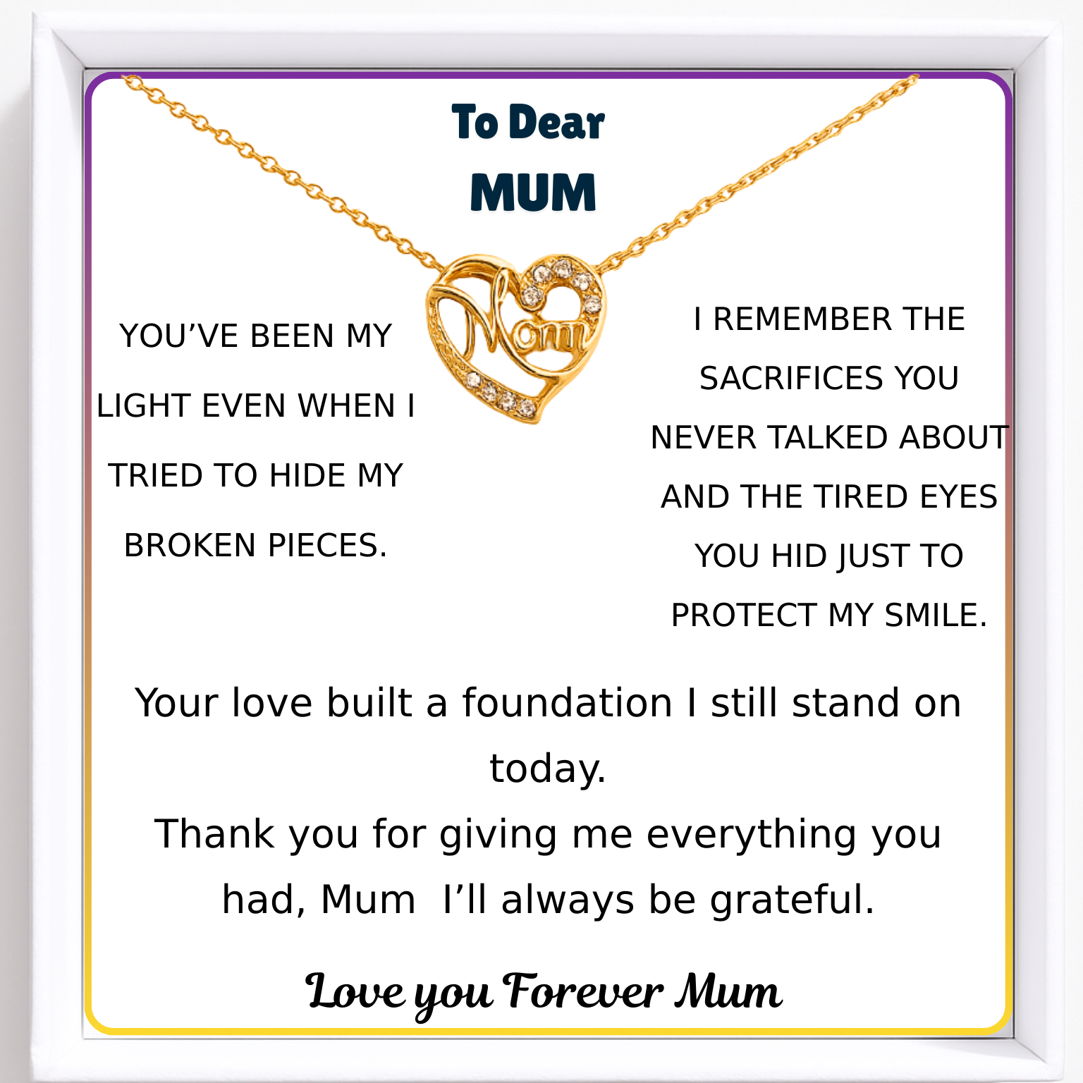 ✔️ Heartfelt Symbolism – A heart pendant with “Mum” at the center, celebrating her as your first home.