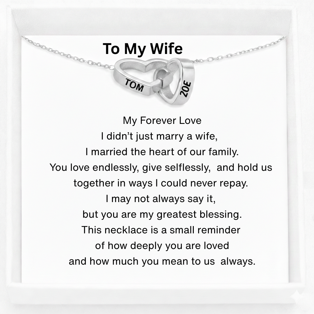 Celebrate your wife, not only as the woman you love, but as the heart of your family, with the Interlocking Hearts Name Necklace. Each heart can be engraved with meaningful names, turning this piece into a deeply personal keepsake that reflects love, commitment, and the life you share together.