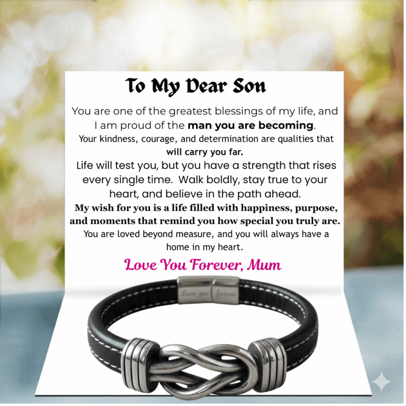 Bold Steps Infinity Bracelet is a meaningful expression of pride and guidance a keepsake to remind him he is loved and supported in every step of his journey.