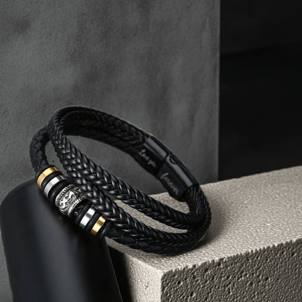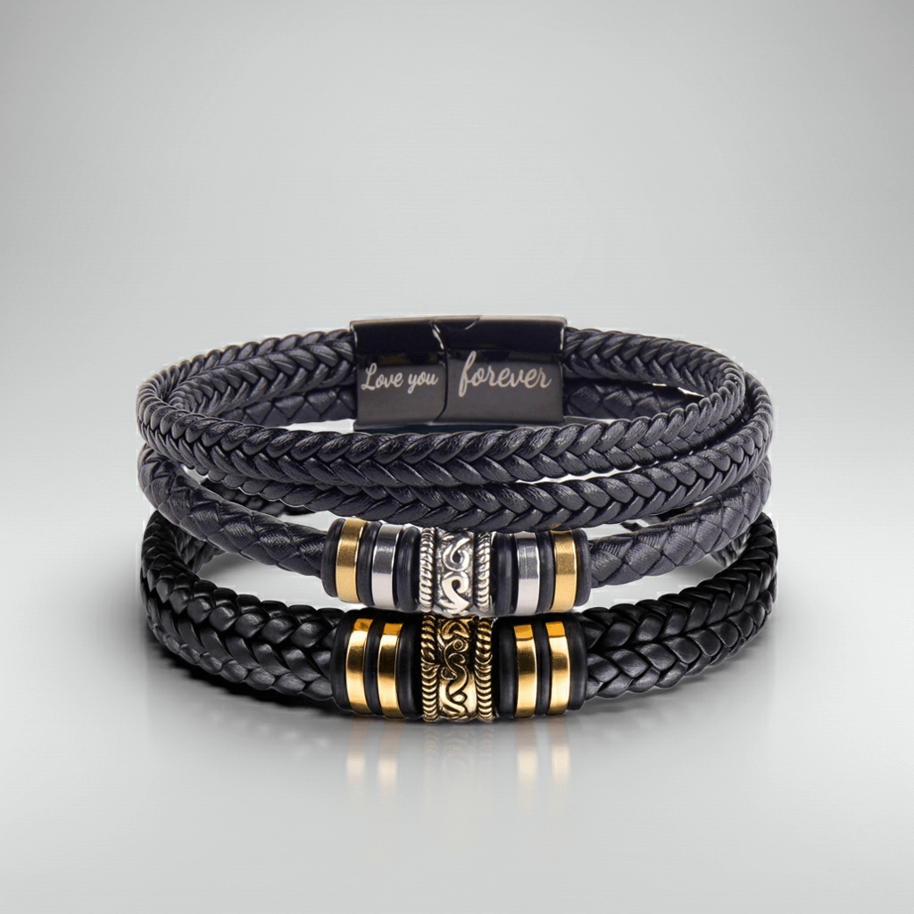The bracelet features a premium braided leather strap and a polished stainless-steel clasp engraved with Love You Forever – a timeless symbol of guidance and strength.
