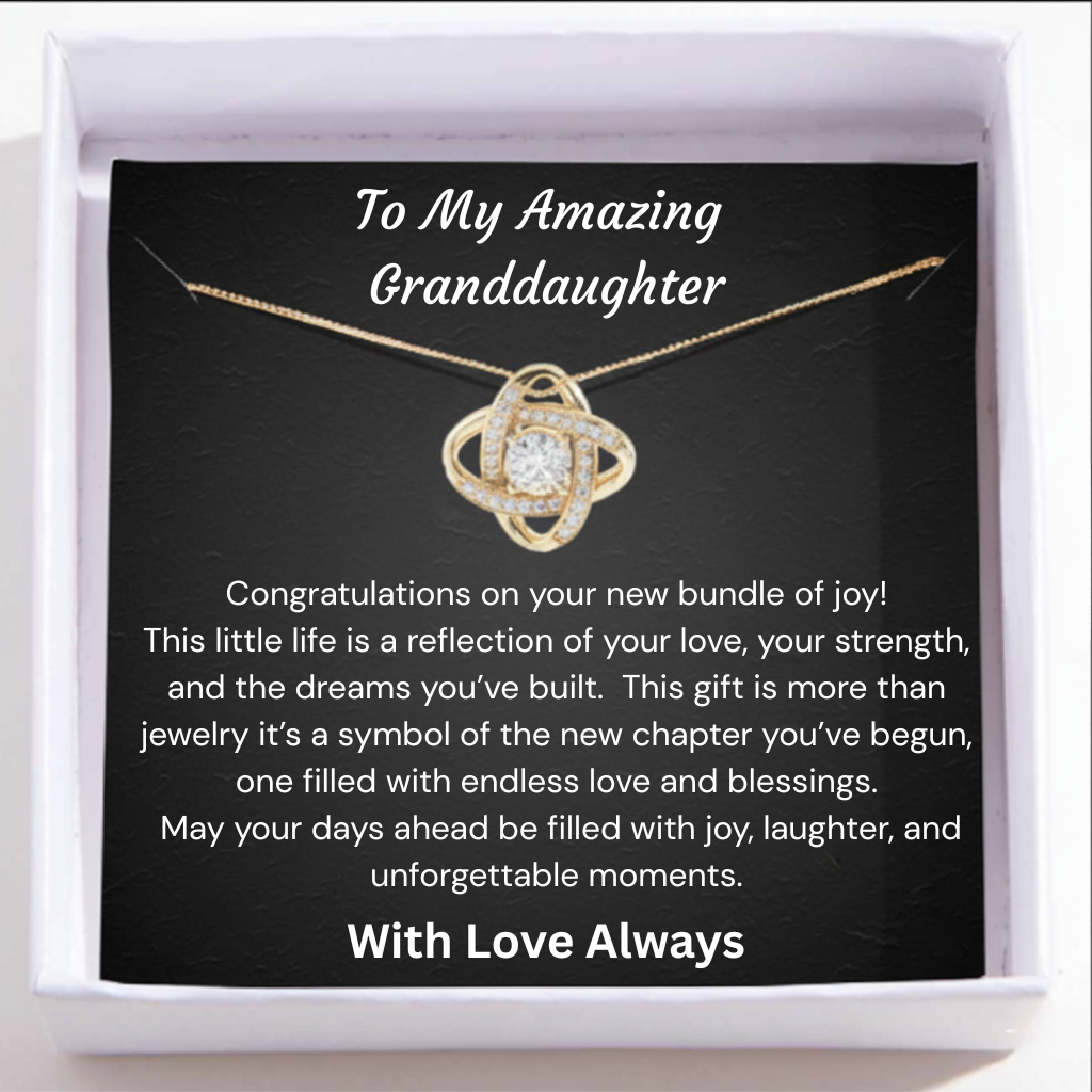 Mark the beginning of her journey with a gift that carries your love and pride. The New Baby – Dear Granddaughter Eternal Knot Necklace is a lasting reminder of family, love, and the joy of new beginnings.