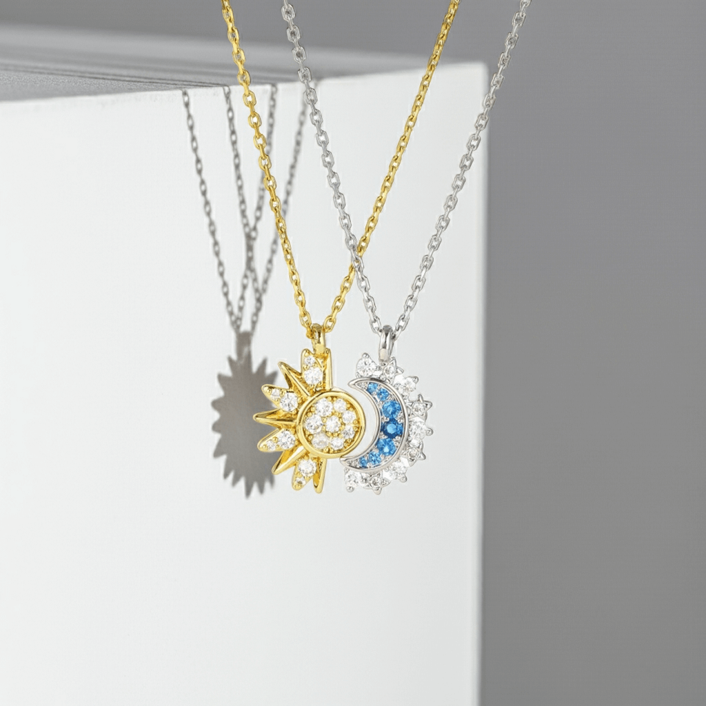 - Matching friendship set: one sun necklace (gold) and one moon necklace (silver)