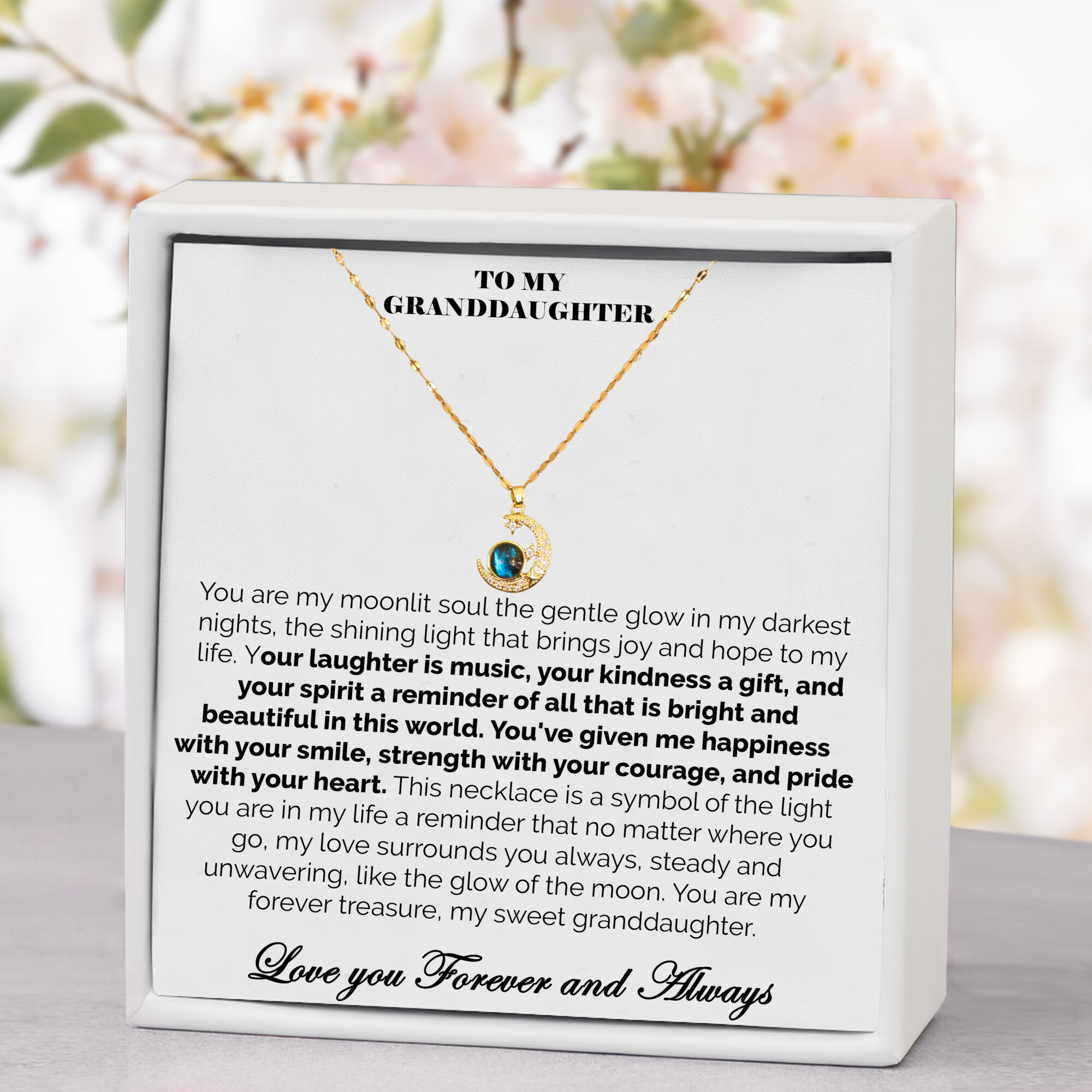 A beautiful way to celebrate your granddaughter’s birthday, graduation, or any milestone. The Moonlit Soul Necklace is a glowing symbol of love, courage, and the unbreakable bond you share.