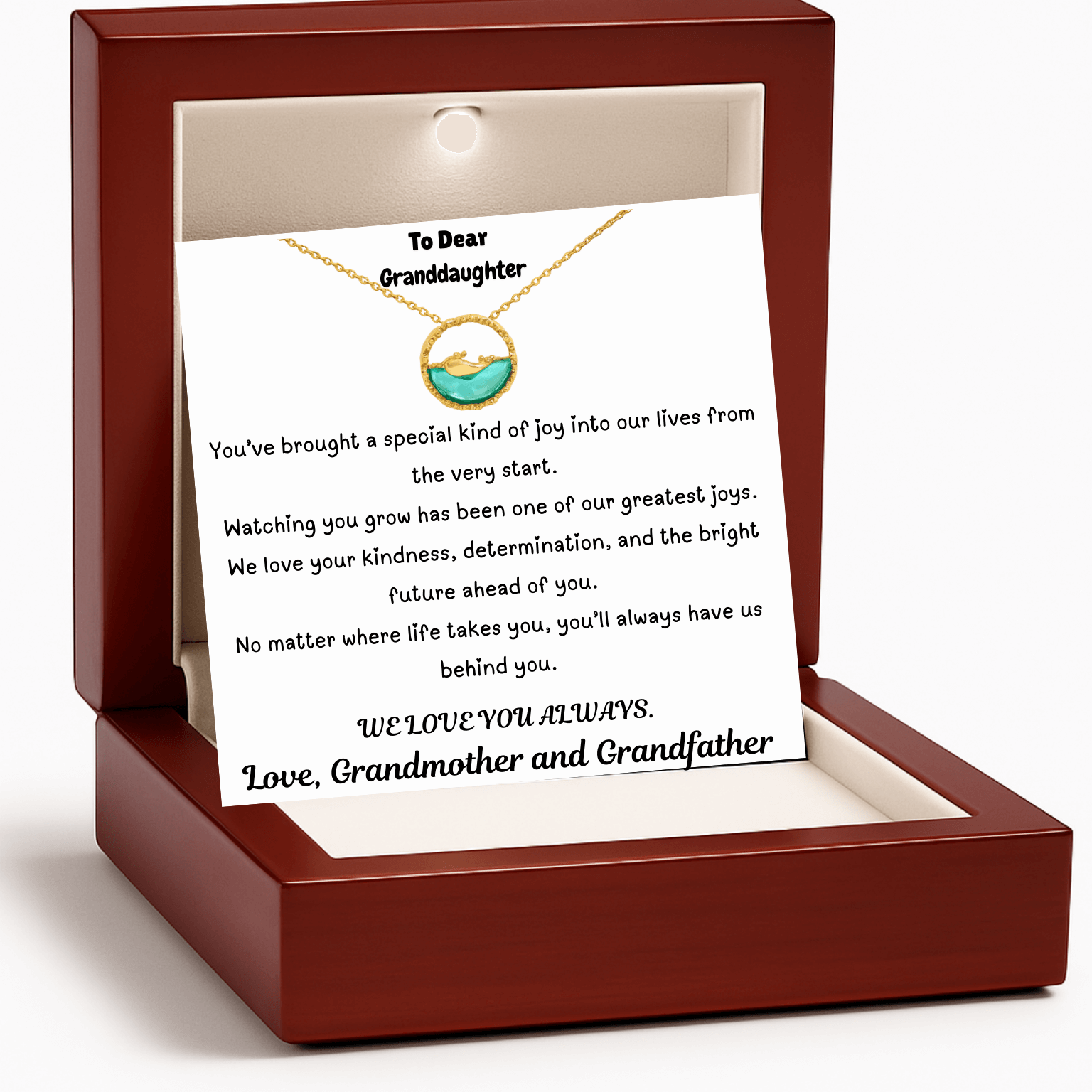 Show your granddaughter just how much she means to you with this meaningful ocean-inspired necklace. Designed with a serene wave pendant, it symbolizes strength, calm, and the beautiful journey of life. Paired with a heartfelt message card from her grandparents, this gift becomes a keepsake she’ll treasure forever.